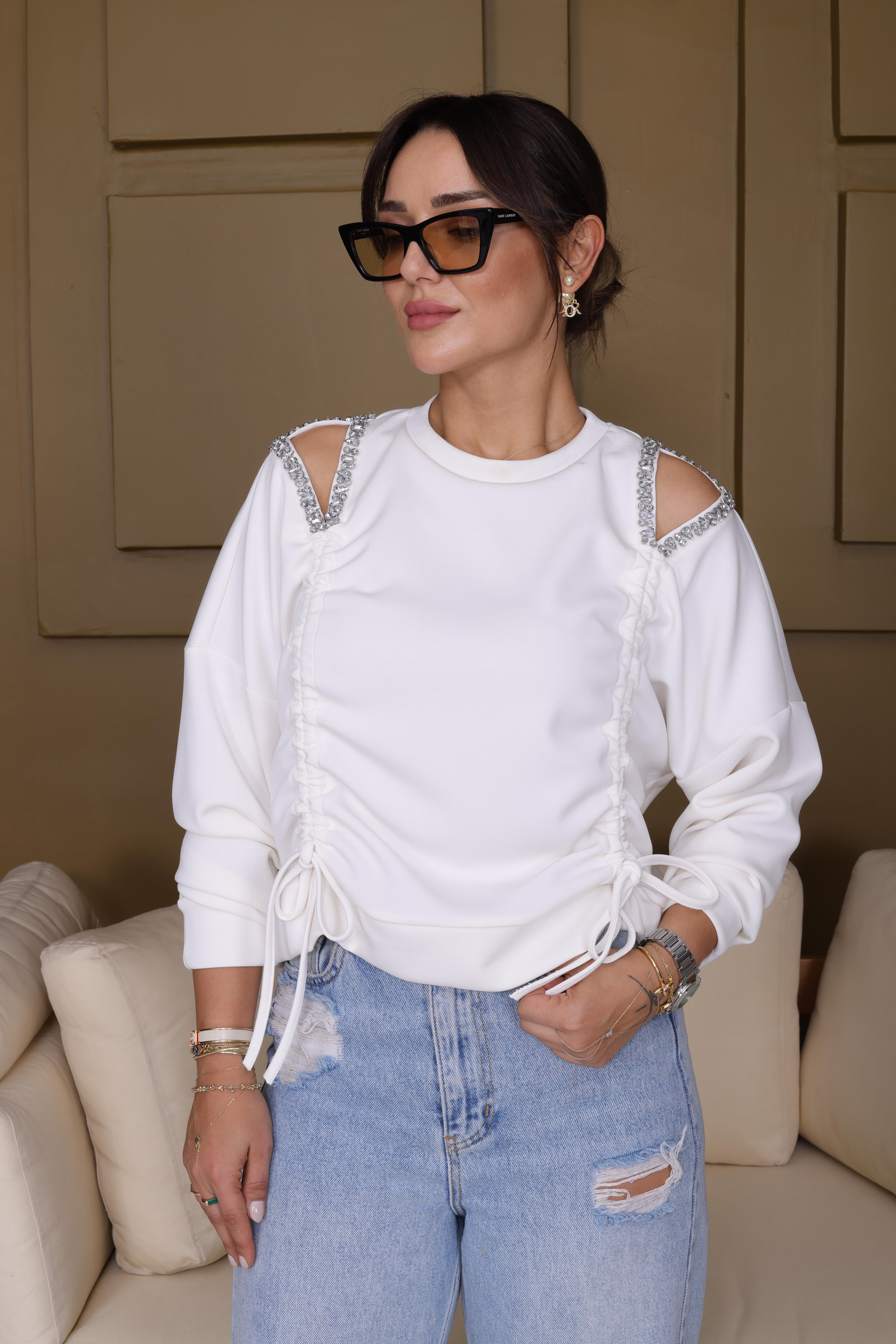 Beyaz Loden Pencere Detay Taş İşlemeli Modal Sweat