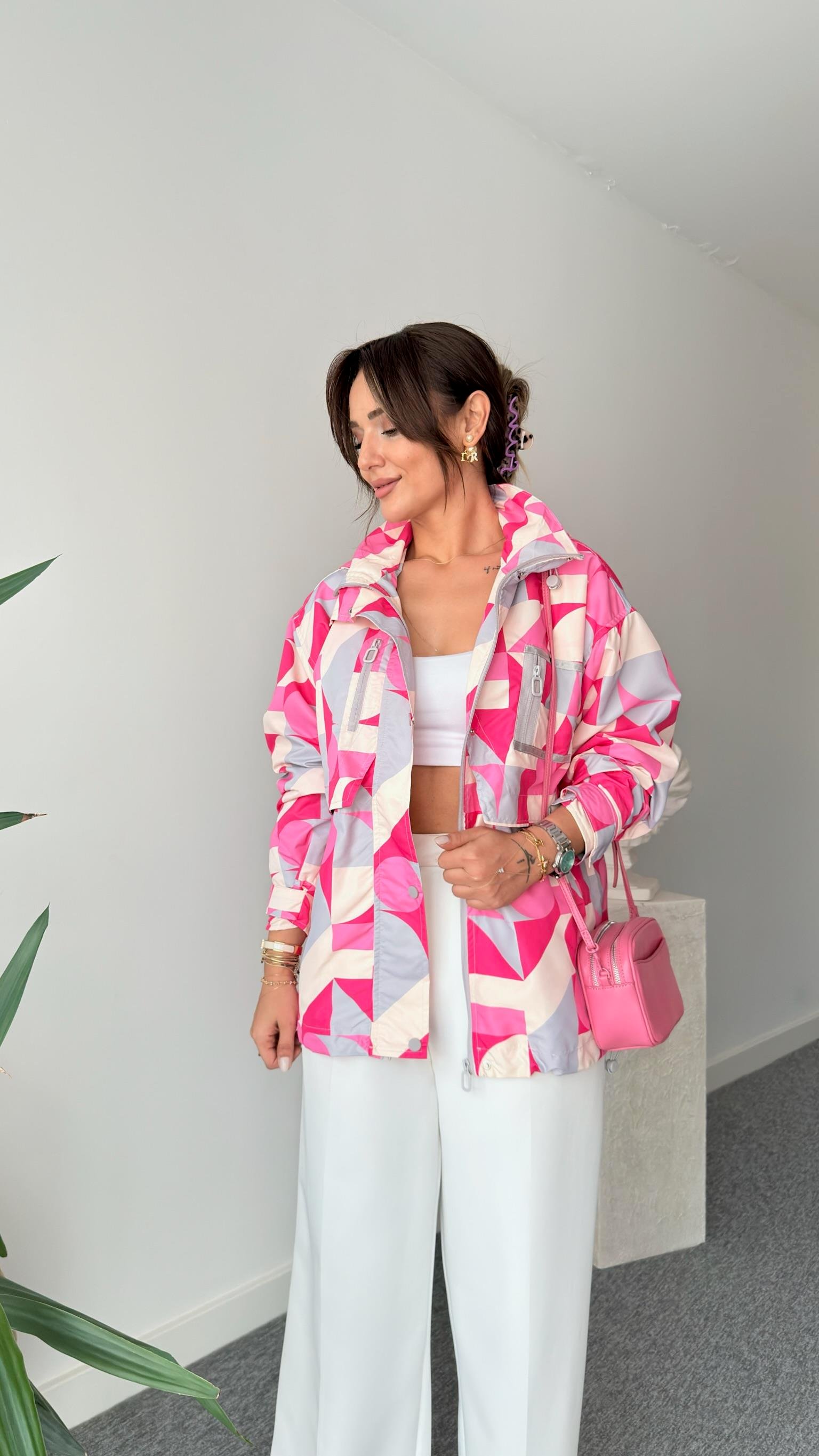 Geometrik Desen Fuşya Yağmurluk