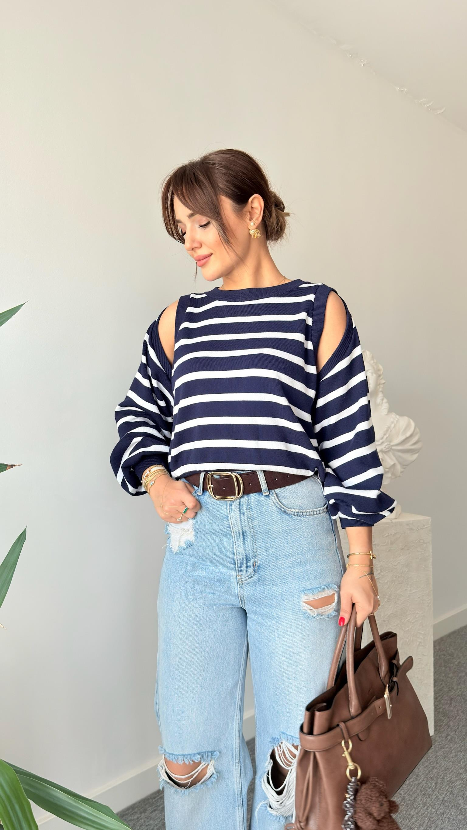 Laci Beyaz Çizgili Pencere Detaylı Kazak