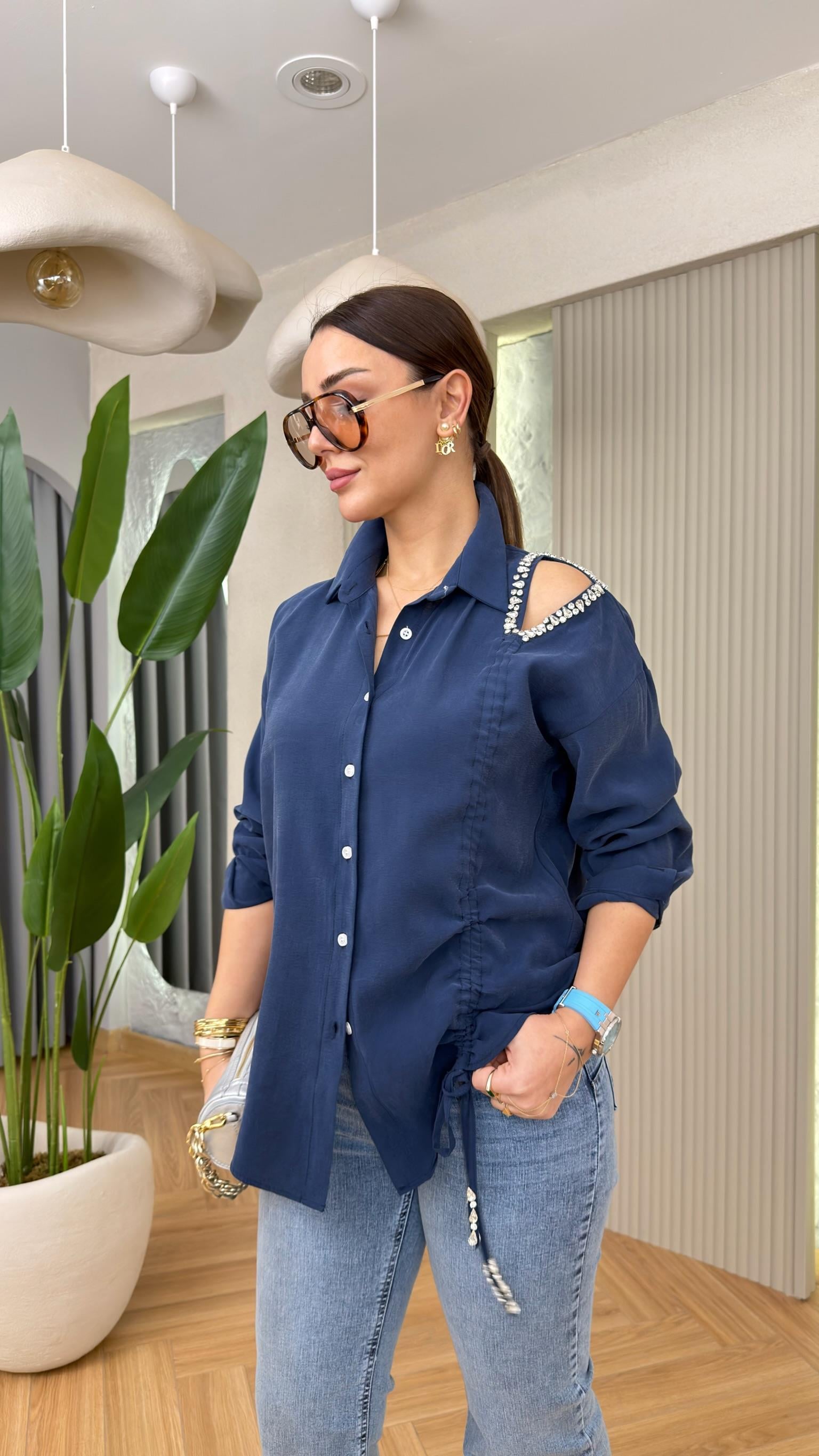 Lacivert Natha Büzgülü Taş Detay Tensel Gömlek