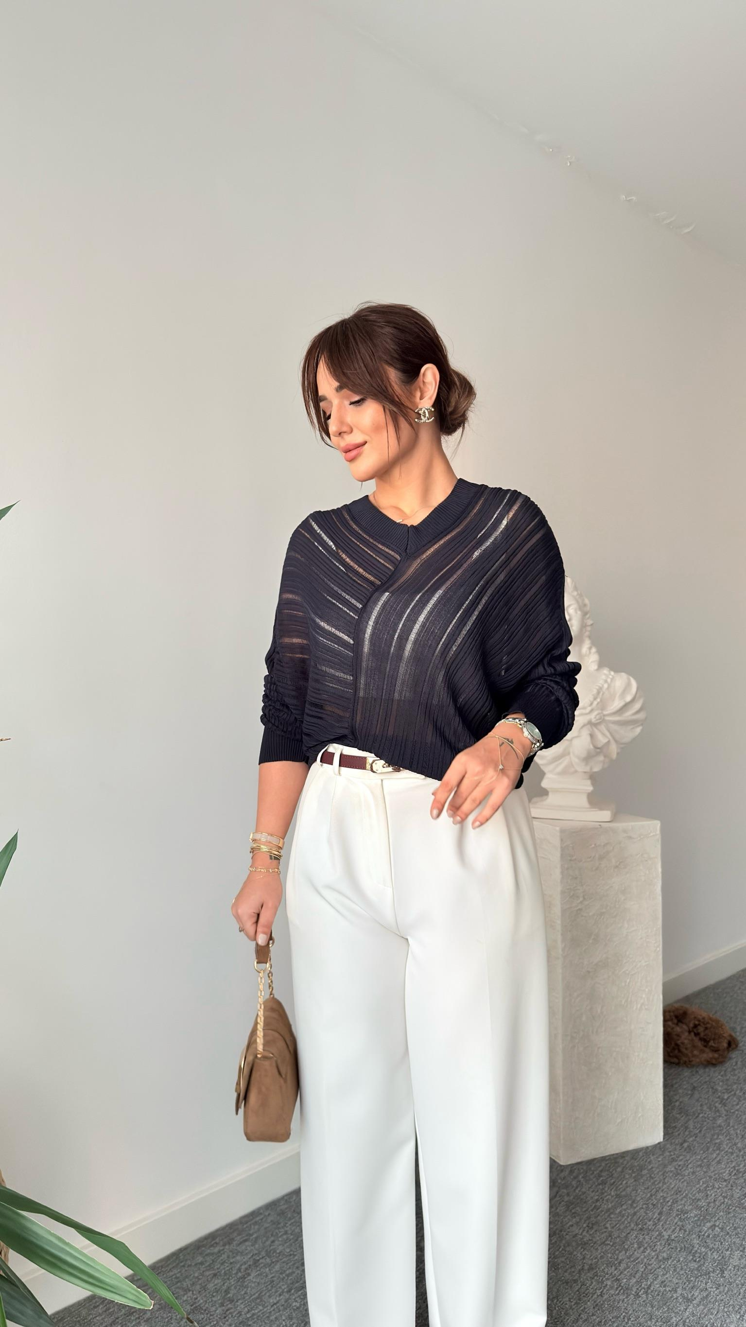 Lacivert V Yaka Asimetrik Transparan Triko Kazak