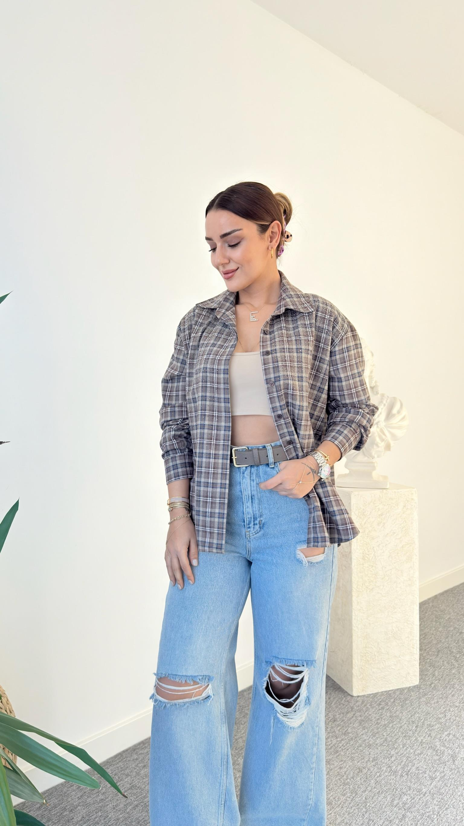 Mavi Ekoseli Sesira Taş Detaylı Gömlek