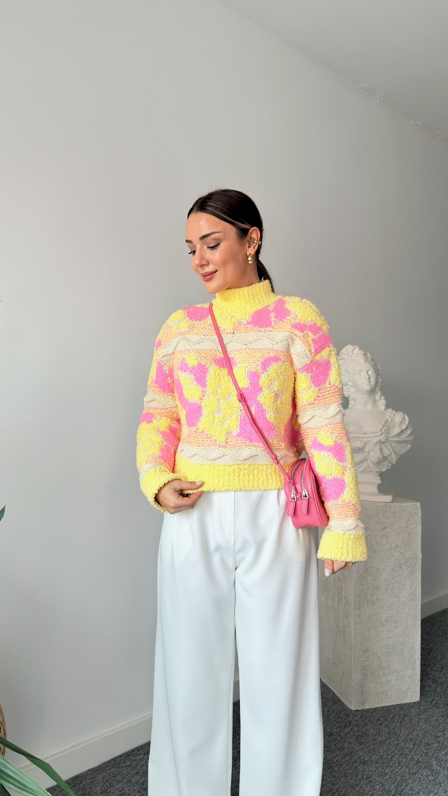 Sarı Pembe Renk Geçişli Örgü Triko Kazak