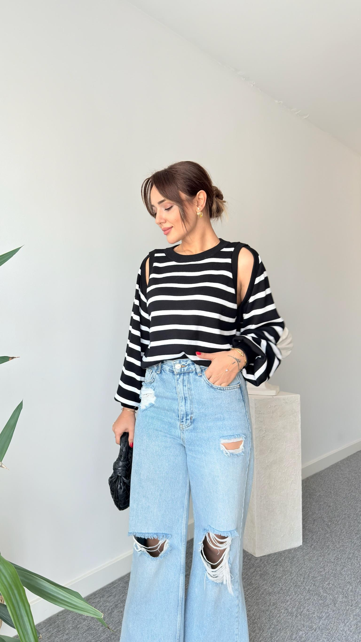 Siyah Beyaz Çizgili Pencere Detaylı Kazak