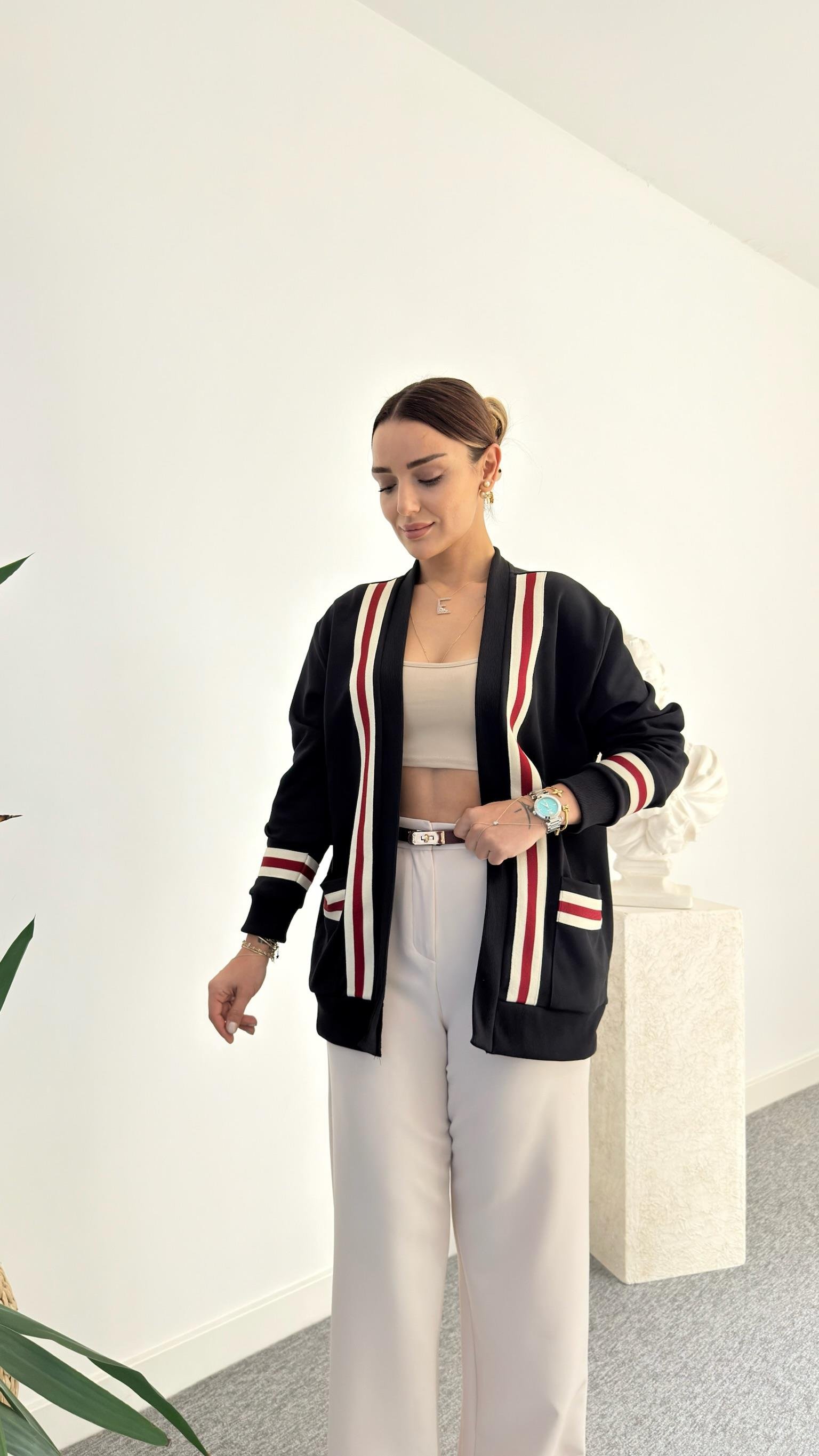 Siyah Linzy Kırmızı Şerit Detaylı Hırka
